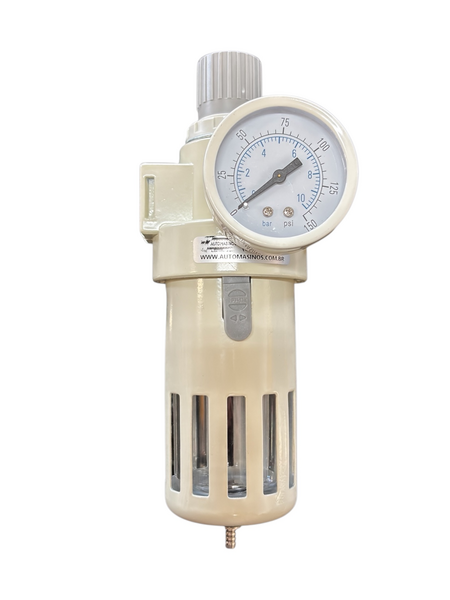 Conjunto filtro regulador para ar comprimido Linha White Automasinos, indicado para proteger o sistema pneumático contra impurezas e umidade, além de garantir regulagem precisa da pressão de trabalho.