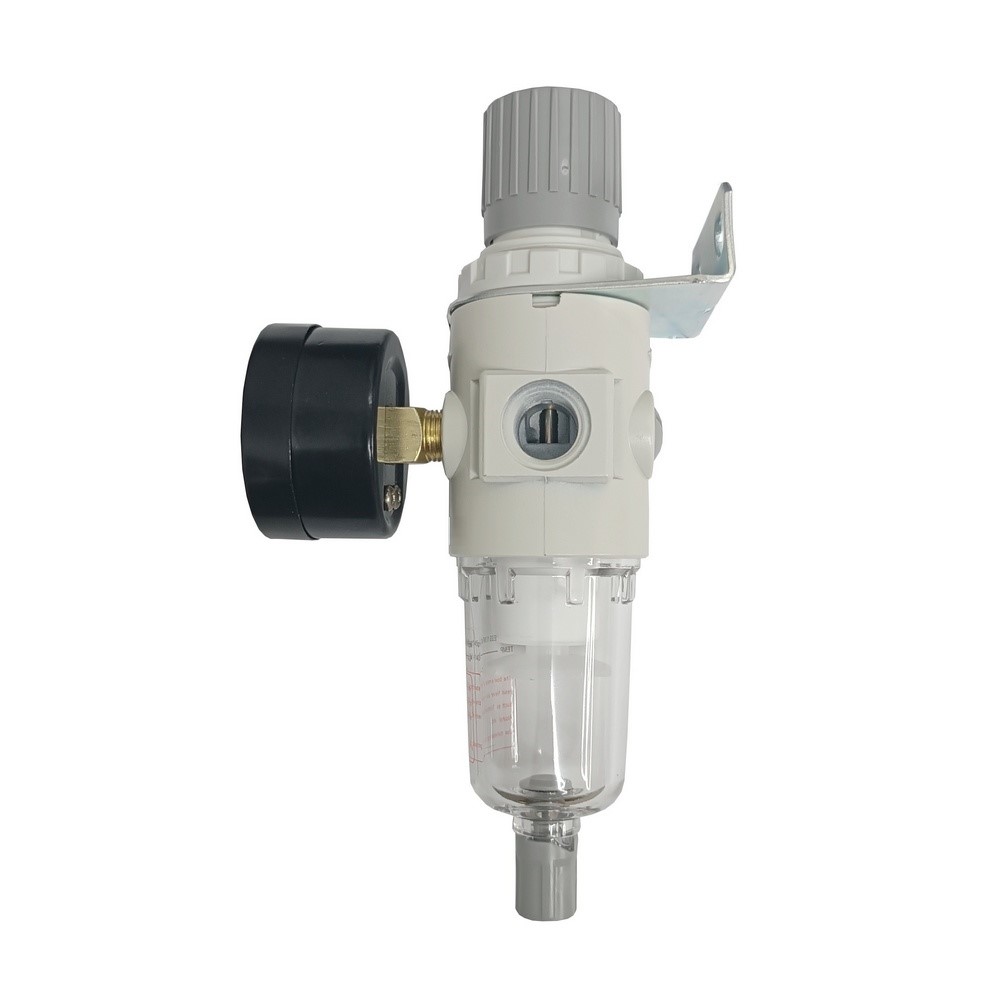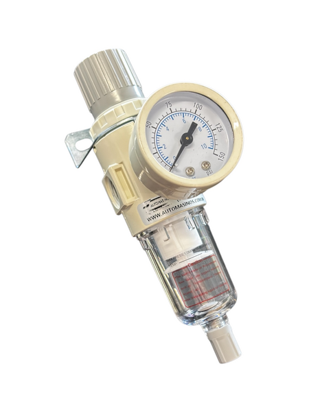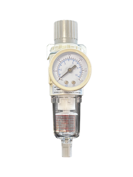 Conjunto filtro regulador compacto para ar comprimido da Linha White da Automasinos, desenvolvido para remover impurezas e condensados do ar e garantir controle preciso da pressão de trabalho em sistemas pneumáticos de pequeno e médio porte.