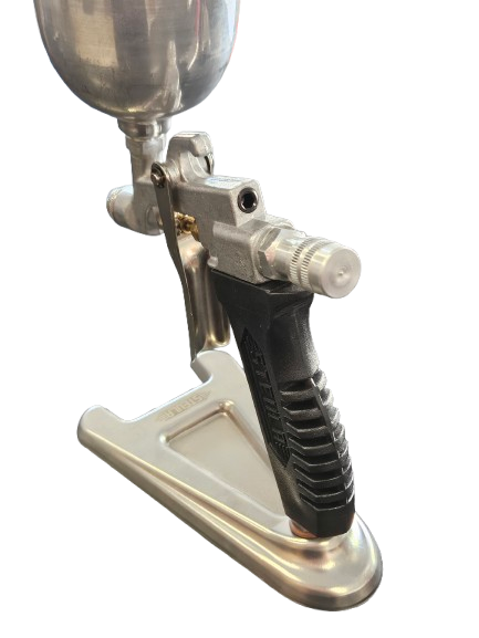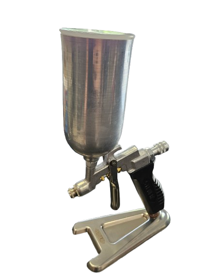 A alimentação da tinta ocorre por gravidade (com a caneca na parte de cima da pistola), o que faz com que esta ferramenta aproveite toda a tinta do fundo da caneca. Permite regulagem do fluxo de tinta. É uma ferramenta leve e de manutenção bem simples.